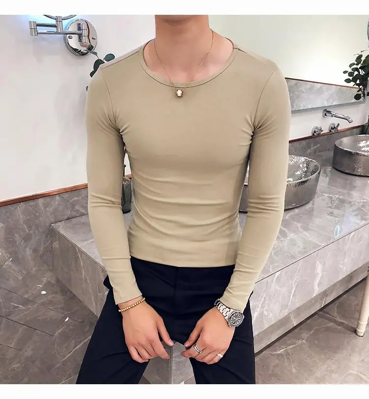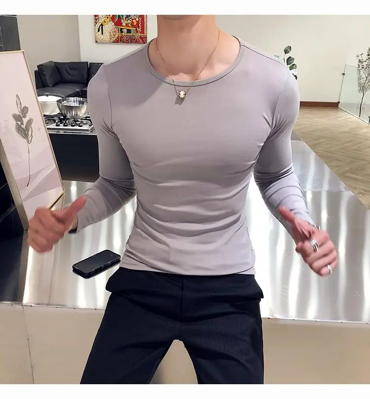 T Shirt for Men British Style O-Neck Men'S T-Shirts Long Sleeve All Match Luxury Slim Fit Casual Elastic Tops&Tees Streetwear